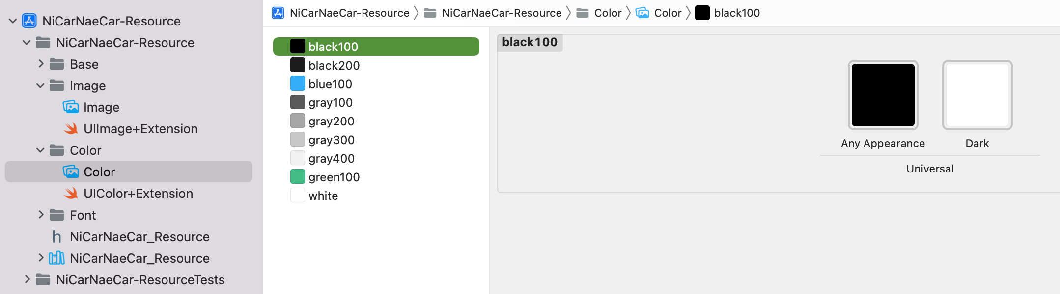 일단, 이번 프로젝트의 규모가 그렇게 크지 않았기 때문에 리소스를 R.swift 또는 SwiftGen을 사용해서 관리하기에는 오버스펙이라고 느껴졌다.