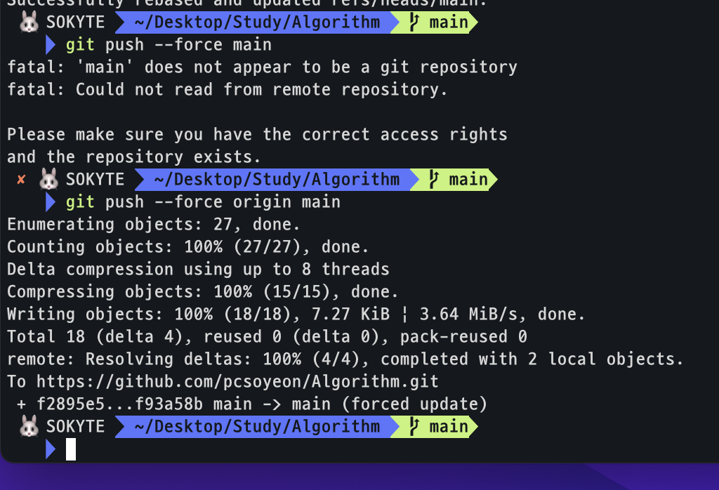 git push --force main 이 아니라 git push --force origin main으로 입력해야 한다는 것을 확인할 수 있다.
