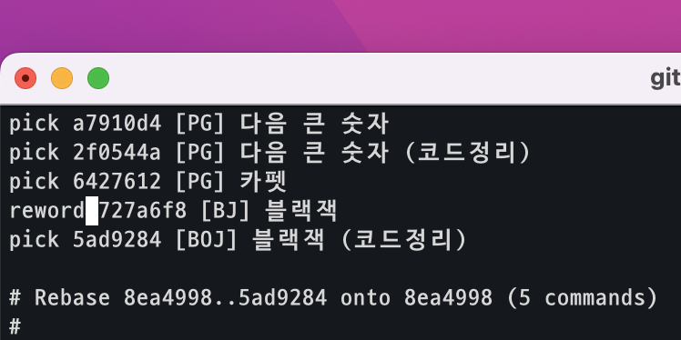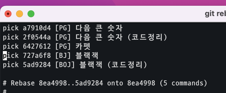 git rebase -i HEAD~5 명령어를 입력하면 다음과 같이 출력됩니다.